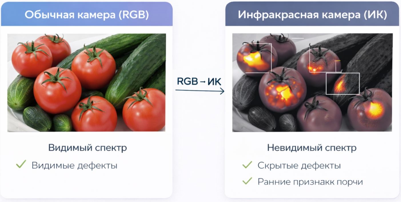 • Инфракрасная/мультиспектральная камера (ИК). Позволяет обнаруживать скрытые дефекты, признаки порчи, внутренние неоднородности и изменения структуры, недоступные визуальному контролю.