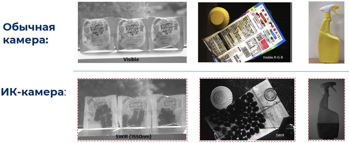 • Обычная камера (RGB). Используется для анализа продукции в видимом спектре: выявление внешних дефектов, повреждений, отклонений по цвету, форме и геометрии.