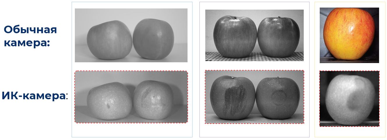 • Инфракрасная/мультиспектральная камера (ИК). Позволяет обнаруживать скрытые дефекты, признаки порчи, внутренние неоднородности и изменения структуры, недоступные визуальному контролю.